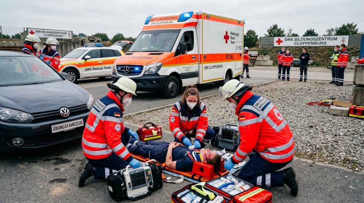 Elf Notfallsanitäter-Azubis des DRK Cloppenburg bereiten sich auf dem „Areal 51“ auf ihr Staatsexamen vor. Realistische Szenarien trainieren den Ernstfall für die höchste Rettungsdienst-Qualifikation.